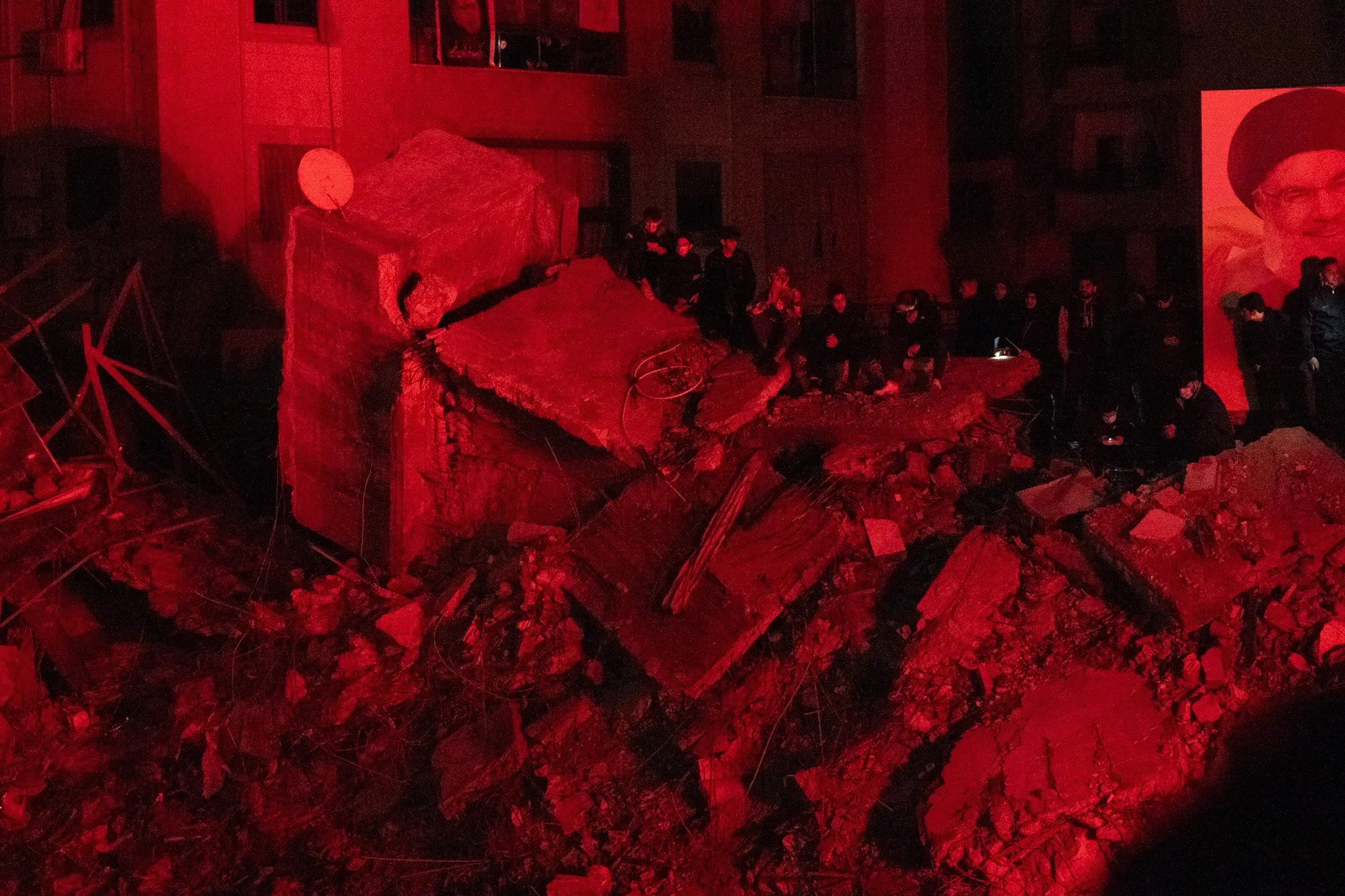 At a memorial, young people sit around the 20-foot-deep-strike site where bunker-buster bombs killed Hassan Nasrallah.